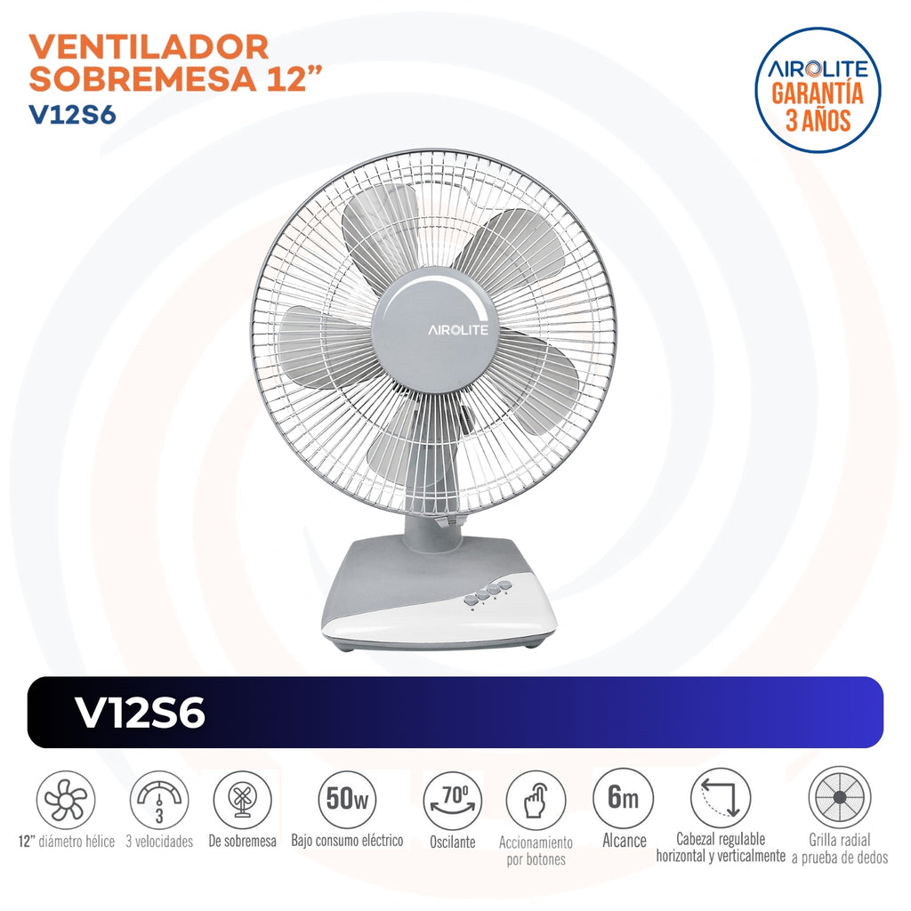 Disfruta de un ambiente fresco y confortable en tu hogar u oficina con el ventilador de sobremesa Airolite V12S6. Su diseño moderno y funcional, junto con su potente desempeño, lo convierten en la solución ideal para enfrentar los días calurosos con eficiencia y seguridad.