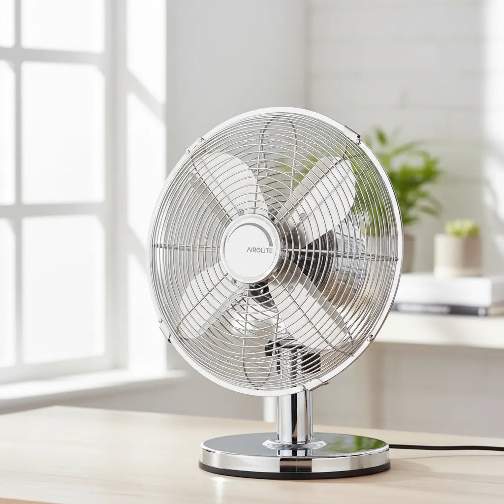 Dale un toque elegante y funcional a tus espacios con el Ventilador Sobremesa V12SM Airolite Metal. Su diseño retro con terminaciones en color plata y aspas metálicas no solo complementa la decoración de tu hogar, sino que también ofrece un rendimiento superior para combatir el calor del verano. Fabricado completamente en metal, combina la durabilidad de los materiales clásicos con la tecnología eficiente del presente.