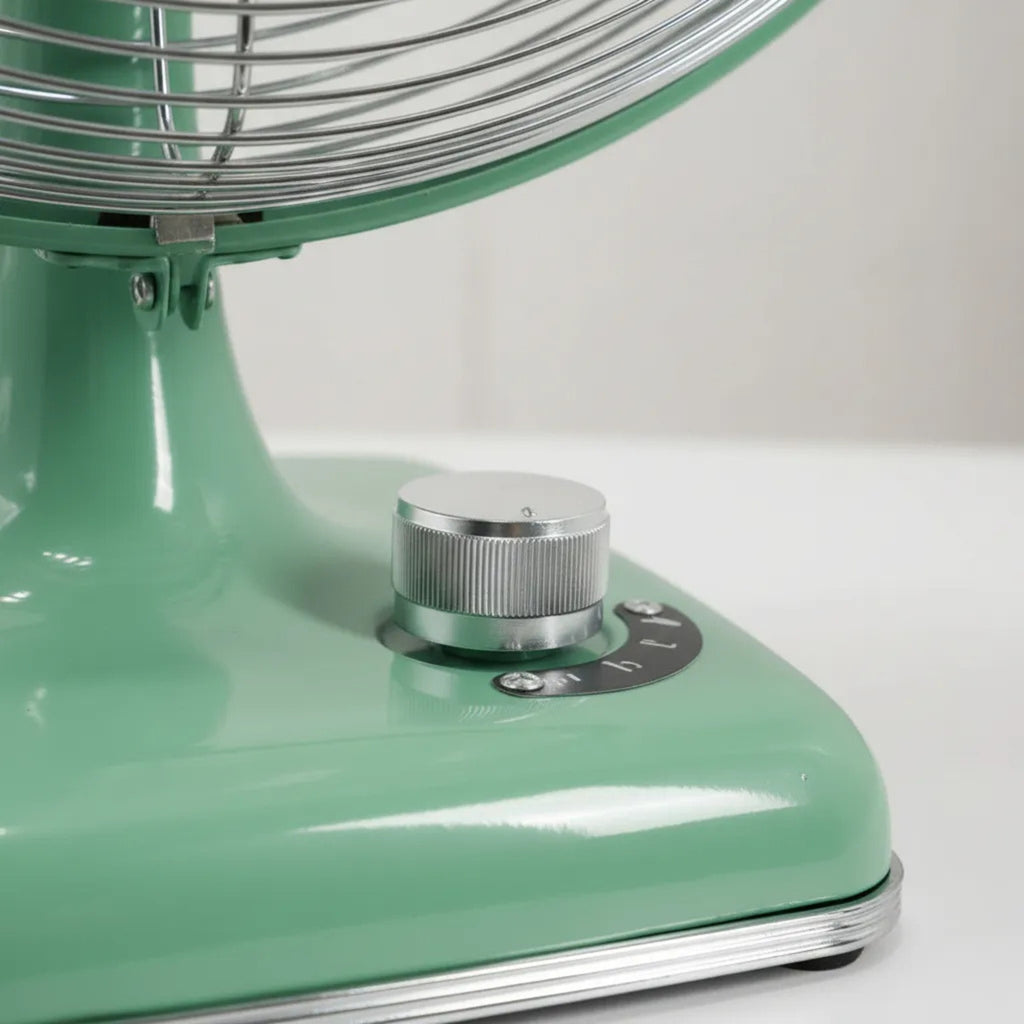 Con un diseño vintage en tonos verde y blanco, este ventilador de sobremesa evoca el encanto de décadas pasadas, fusionando estética retro con tecnología moderna. Su estructura robusta y acabados cuidadosamente seleccionados lo convierten en una pieza decorativa y funcional, ideal para quienes valoran el estilo sin renunciar al confort.