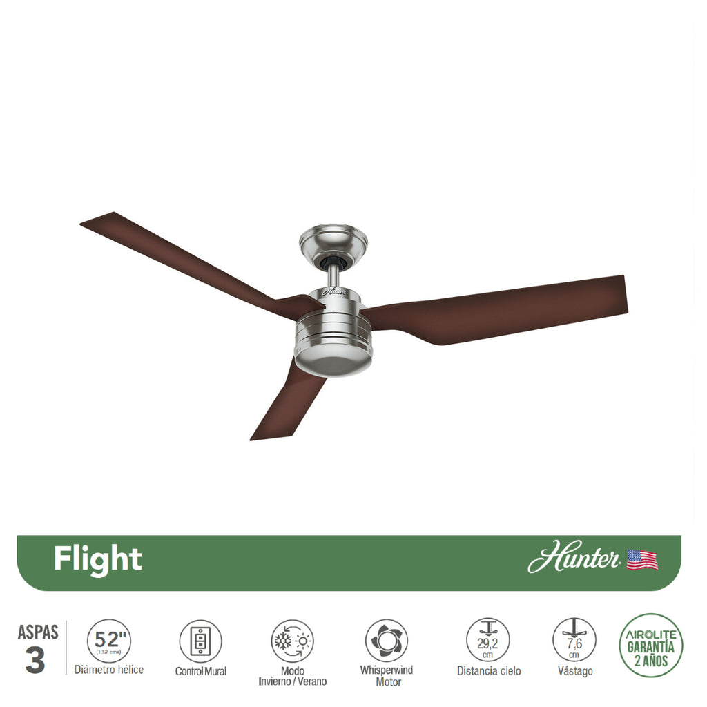 El Ventilador de Techo Hunter Flight 52" es la combinación perfecta de estilo, eficiencia y comodidad para cualquier espacio de tu hogar u oficina. Con un diámetro de 52" (132 cm), este ventilador asegura una cobertura ideal en habitaciones amplias, ofreciendo un flujo de aire de 8.848 m³/h para mantenerte fresco en los días más calurosos. Su diseño moderno con hélices de 3 aspas y revestimiento en níquel cepillado lo convierten en un complemento decorativo que realza cualquier ambiente.
